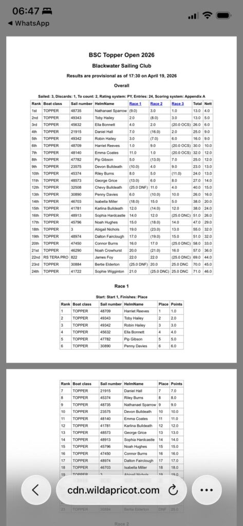 Huge congratulations to Ella Bonnett and Pip Gibson for their fantastic performance at the Blackwater Sailing Club Topper Open on 19 April 2026. Competing in a strong fleet of 24 boats, Ella secured an impressive 3rd place, with Pip finishing a brilliant 8th.