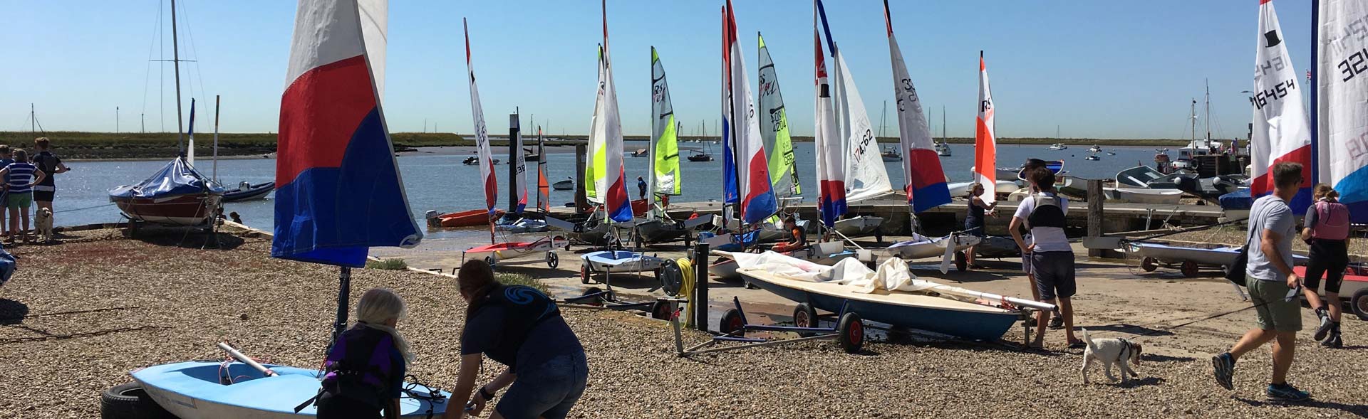 The sailing club has over 270 subscribing members (about 580 people in all). Its premises are a purpose-built Clubhouse, containing a clubroom with kitchen, changing rooms, showers and a race officers’ bridge. The dinghy park fronts onto the river, with a concrete ramp giving access at all states of the tide and there is a pontoon which dries out at low water. Locked storage for oars, outboard motors and petrol is available. There is also supplementary storage for some yacht tenders in a covered (but flooding!) shed on the quay. The club has no moorings available itself; application should be made to the New Orford Town Trust.