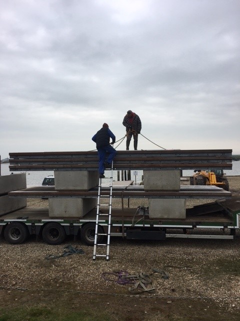 Over the winter, we have been planning the renewal of the pontoon. The pontoon has seen over 20 years service and was in need of a makeover. Take a look at the Webcam (link can be found on website homepage) and you will see that the pontoon has been removed. We attach some photos of the new components of the pontoon arriving for assembly at the sailing club.